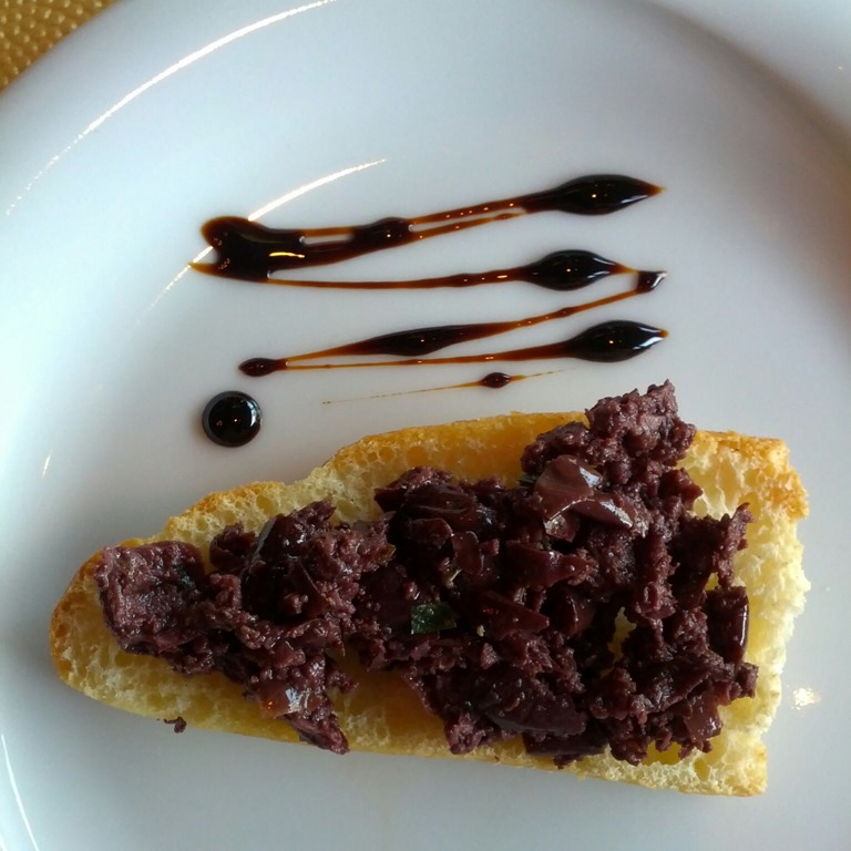 We started with a sautéed black olives on a small piece of bread appetizer. In the center under the black olives was a small amount of humus. We had a nice light bread with a herb, mayo, and butter spread.