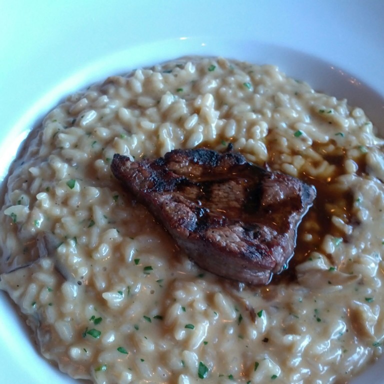 My wife had a beautiful small filet on a bed of mushroom risotto. The risotto had a nice light mushroom taste that was not soupy. She also got a side of sautéed spinach and garlic that had just the right amount of garlic and was not overpowering.