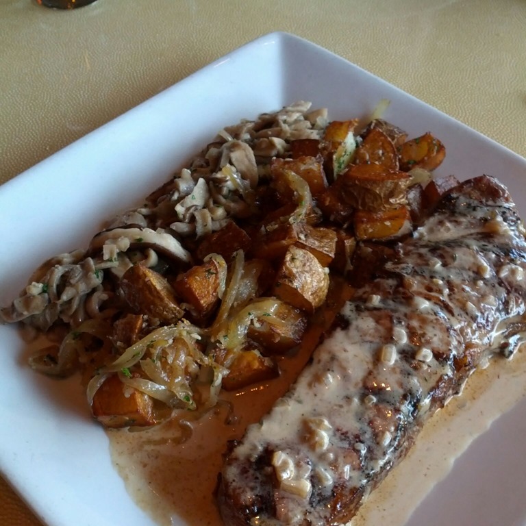 My steak was cooked perfectly with a wonderful peppercorn sauce. I thought the small bits of onion in the sauce were a nice touch. The wild mushrooms were sautéed ever so lightly, a change from the usual dark fully sautéed mushrooms you get in many restaurants. The roasted potatoes were very good and lightly dusted with a little garlic.