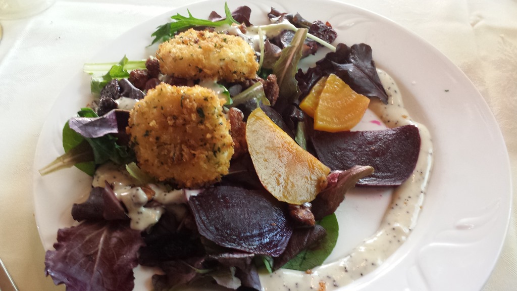 My wife and a friend split a nice looking Beet and Goat Cheese Salad with organic baby greens, goat cheese croutons, yellow & red beets, candied walnuts, dried cherries, and poppy seed dressing.