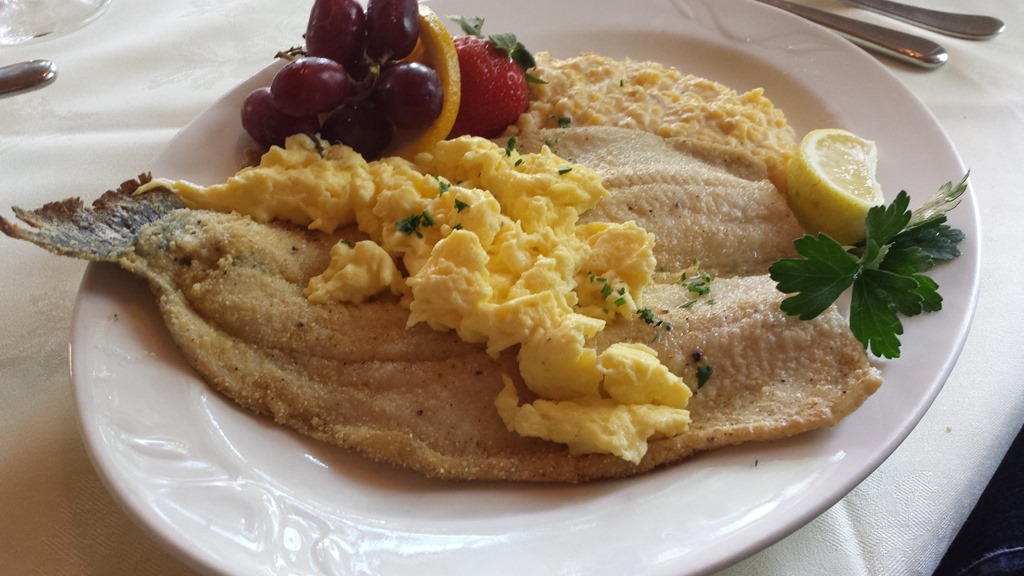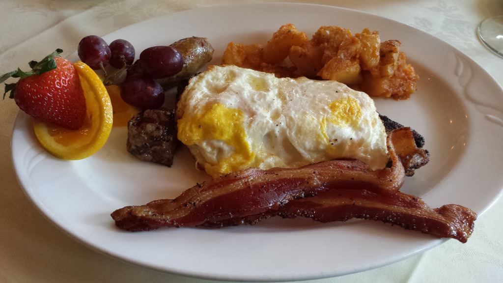 My wife chose the Pan Seared Trout with scrambled eggs. The trout was moist and not over cooked. The selection of fruit was all fresh with strawberries ripened to perfection, a surprise for this time of the year.