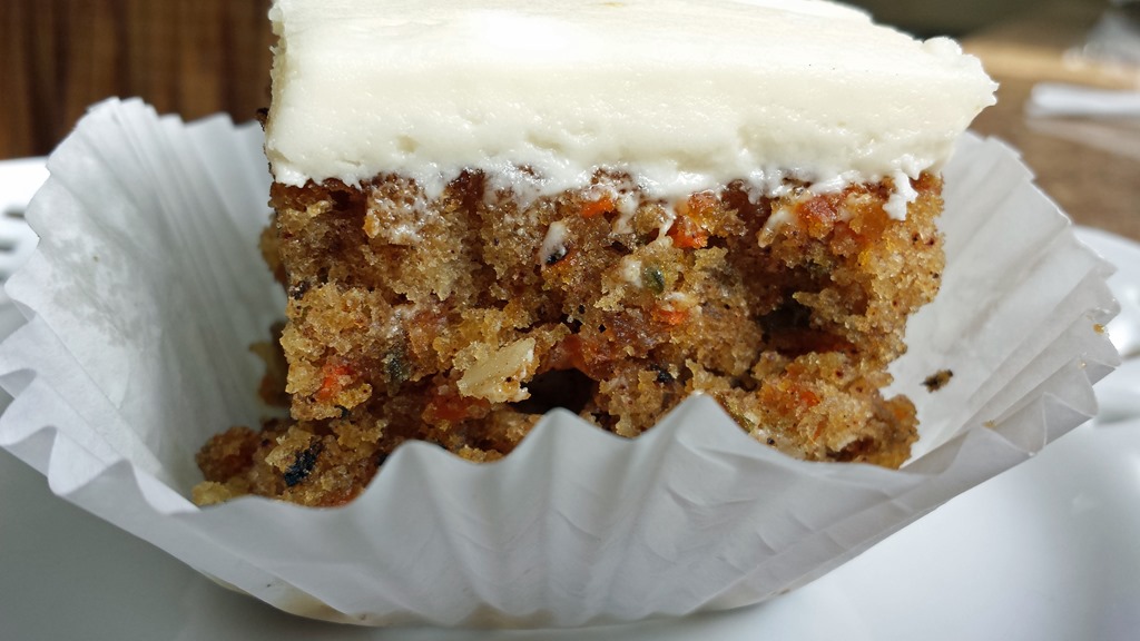 So often I encounter a place that offers a great meal with a ho-hum dessert or vice-versa. I was ecstatic to see Renee maintained the same devotion to dessert as her soups and sandwiches. This carrot cake was off the charts scrumptious. The frosting melted in your mouth and didn’t leave that sugar rush taste. The cake had a perfect moist soft dense texture and carrot flavor.