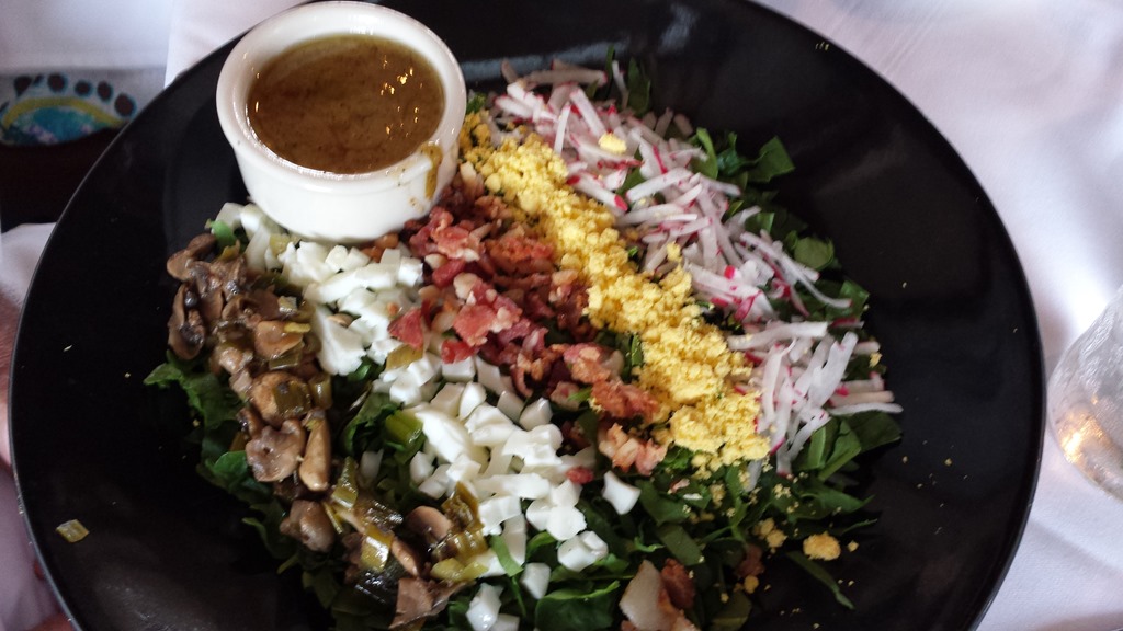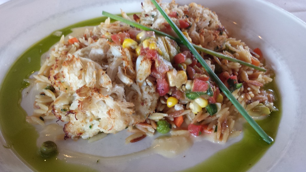 My cousin had Crab cakes with Avocado Corn Relish and Lemon Butter served with Toasted Vegetable Orzo. The crab cake was delicious with just enough filler to hold it together and not drowned in Old Bay.