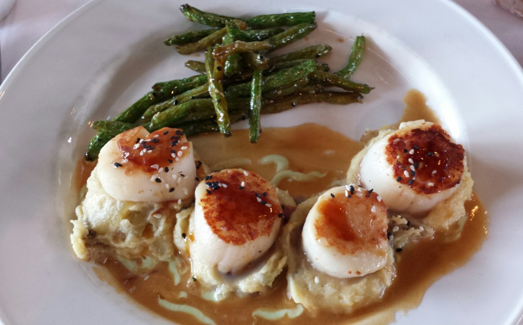 Seafood always tastes better when you can see the water. These wonderful scallops were perfectly cooked and topped with a Ginger Soy Sauce & Wasabi Cream on a bed of Wasabi Mashed Potatoes with Asian Green Beans. The sauce had the familiar Wasabi bite and was a nice complement to the mashed potatoes.
