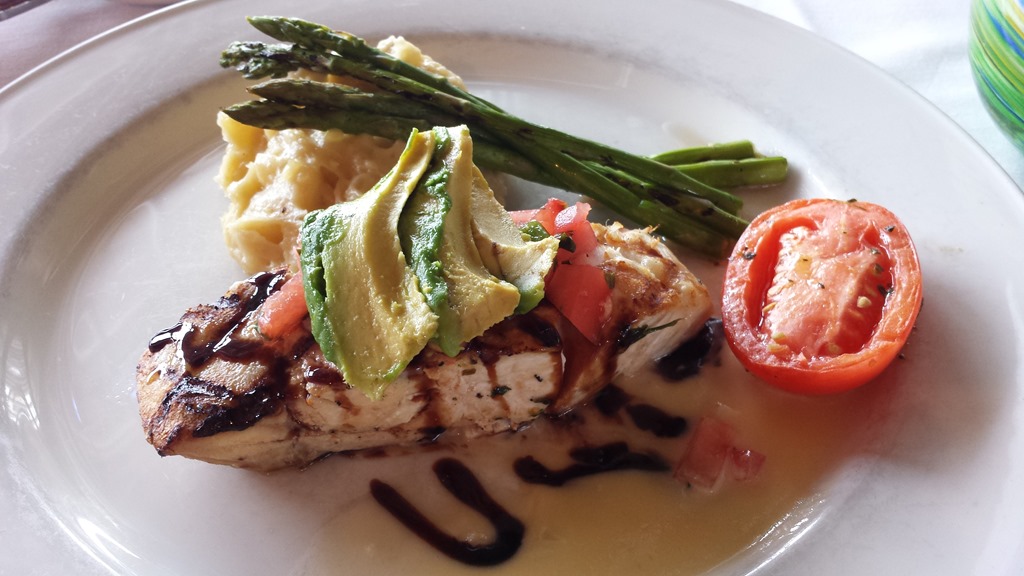 My wife tried one of the Chef’s Features, the Rockfish Del Mar topped with Grilled Tomato Pico de Gallo (a fresh chopped salsa), Avocado and Balsamic Glaze served with Yukon Gold Mashed Potatoes. She liked the fish and said it was cooked perfectly. For my taste I passed on the avocado and took a bite with the balsamic. Rockfish is a mild fish and adding the smooth balsamic cranked it up just a notch making it an appealing dish.