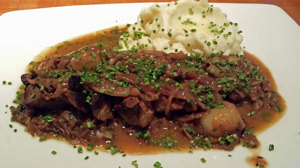 My wife’s dish was the Chef’s Special of Grilled Caves Liver and Onions with Whipped Potatoes. The hand-cut liver was tender with a light liver taste. The combination of pearl and sweet onions in a savory sauce was perfect.