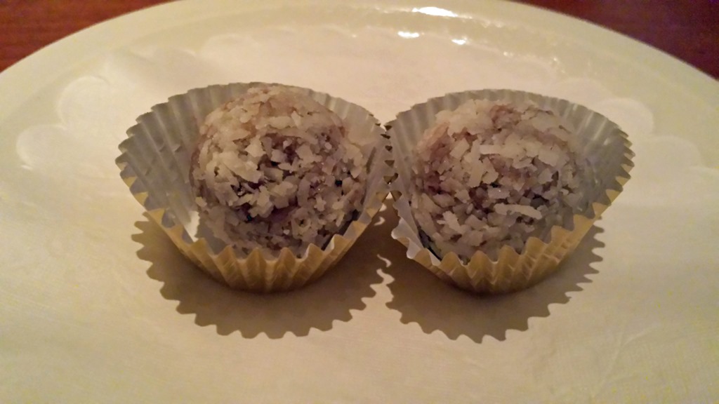 To finish the meal the chef sent us these nice ricotta and cocoa rolled in coconut truffles. I am not fond of coconut but these were really good.