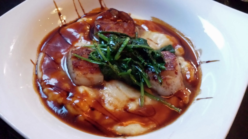 My wife enjoyed her Seared Scallops with Creamy Polenta, Garlic Spinach, and a Red Wine Demi. The scallops were seared flawlessly and not overdone. The red wine demi-glace was sweeter than I have had and just the right consistency to go with the polenta and scallops.