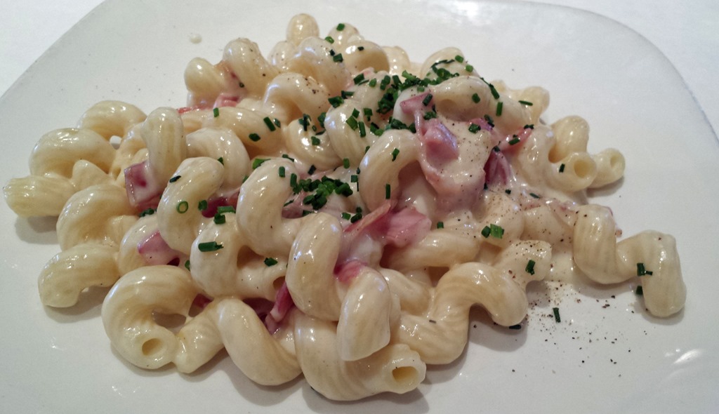 I liked my Prosciutto Mac & Cheese with Cavatappi Pasta, Gruyere, Cream, and Chives appetizer. The cork-screw pasta was cooked firmly and tasty. The gruyere cream sauce was excellent with the prosciutto.