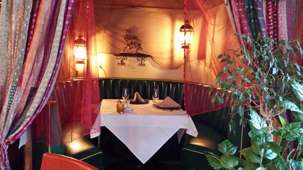 There is a nice secluded table set for two for romantics or spies.