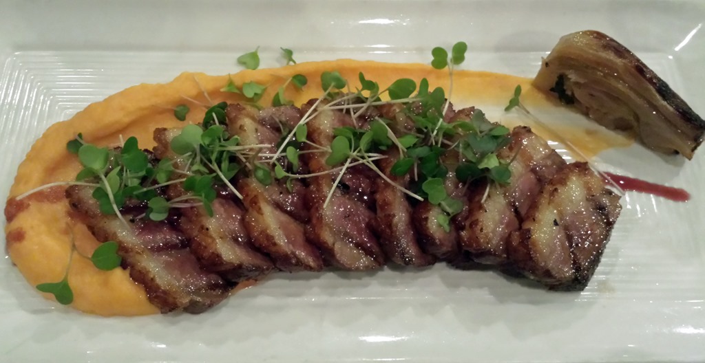 My wife chose the Grilled Moulard Duck Breast with Sweet Potato-Parsnip Purée and Braised Fennel. The duck was perfectly grilled and paired nicely with the purée to soften the stronger dark fatty flavor of the duck.