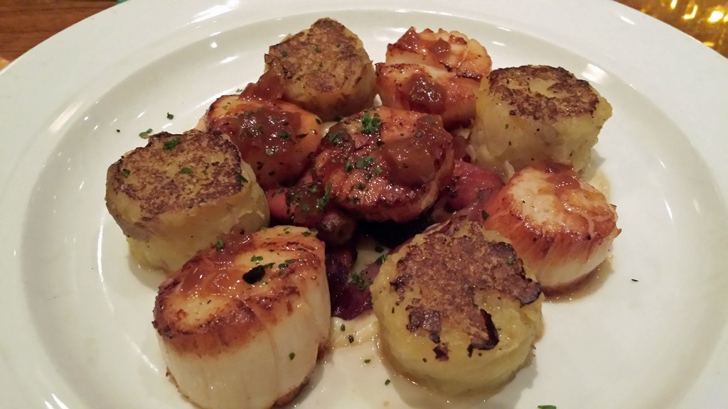 For my main course I chose my favorite, Caramelized Jumbo Sea Scallops with Potato Pancakes and Heirloom Baby Carrots drizzled with a Smoked Bacon Vinaigrette. The plating on this dish surprised me and I must have been muttering something about how many scallops there were when my wife said “you know they’re not all scallops, some are potato pancakes.” Visually I got hoodwinked into missing that every other scallop was actually a lightly crisped potato pancake. In my defense most pancakes you see don’t look like that.