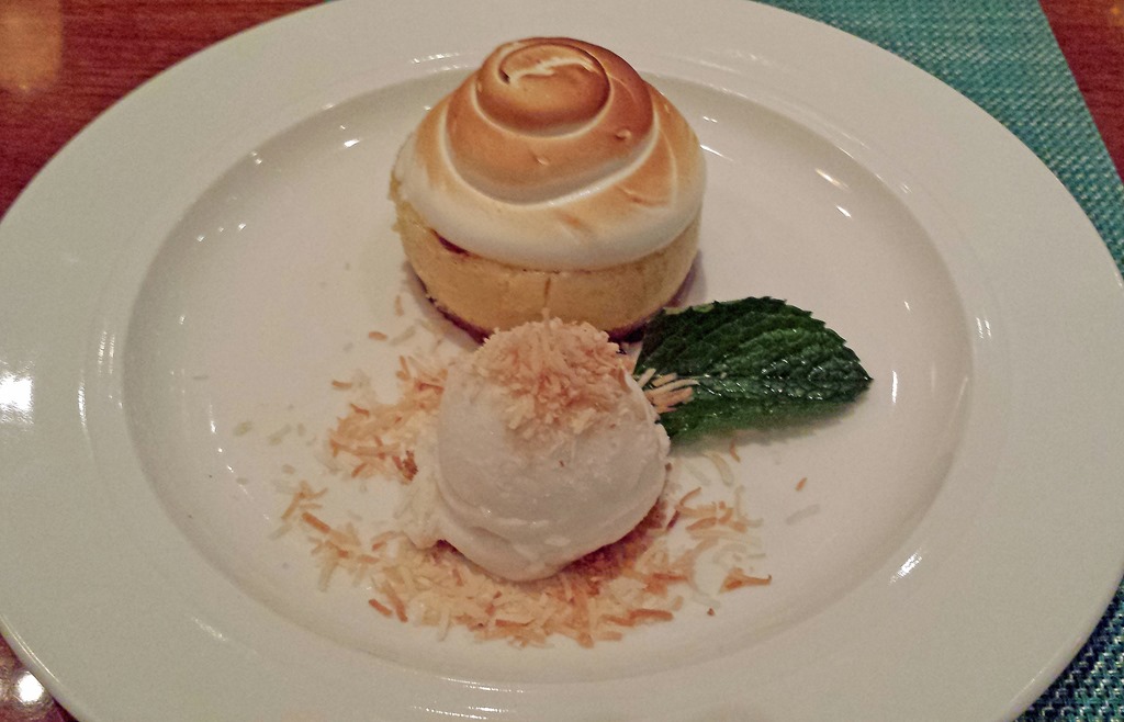 My wife’s dessert was a fantastic Florida Key Lime Tart with a Graham Cracker Crust and Toasted Coconut Sorbet. The tart was delicious, a perfect balance of crunch from the crust and a smooth key lime flavor. The meringue was attractively browned and it held its shape marvelously. As with all the sauces and creams we tasted the chefs really know where that fine line is between ambrosial flavor and harsh abundance. I rarely order key lime pie because I am so often disappointed by the tart taste that has me pushing it away after 2 bites. They really nailed the essence of key lime here.