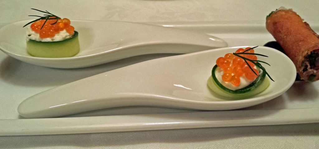 Cucumber wrapped fresh American Salmon Caviar starter from the chef.