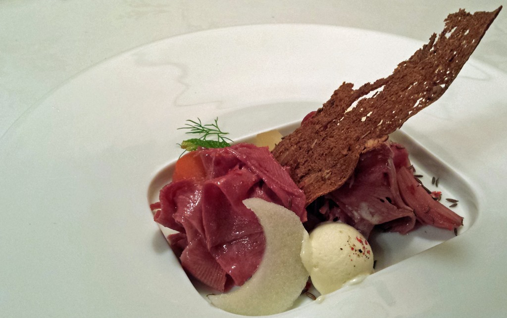 Chilled Veal Tongue with Pickled Root Vegetables and Horseradish Ice Cream.