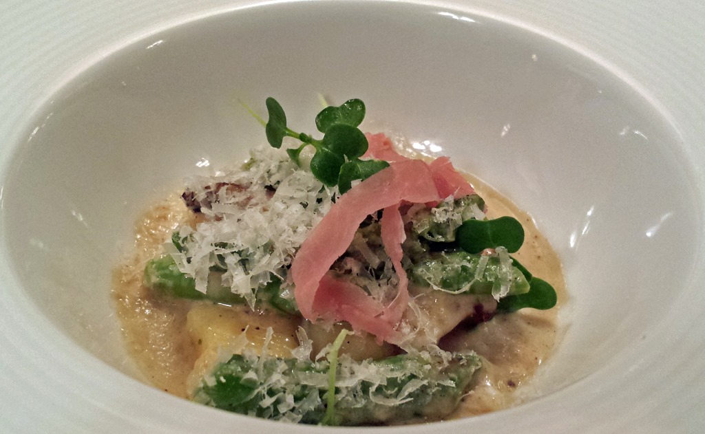 Fricassee of Morels, Potato Gnocchi, and Virginia Country Ham with Asparagus Tips.
