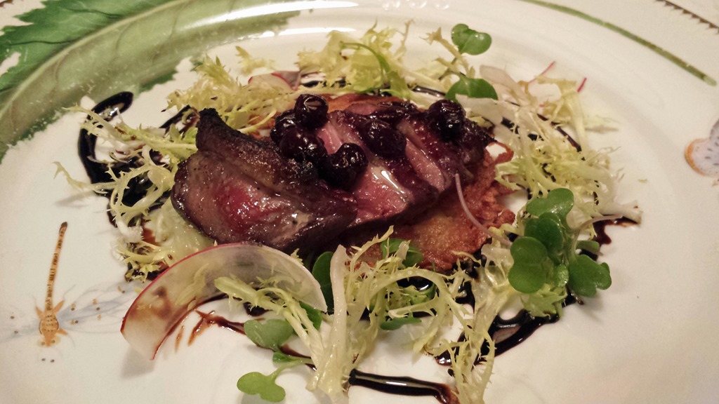 Huckleberry Marinated Squab Breast with a Crispy Potato Galette.