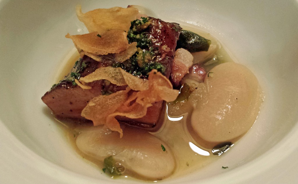 Pork and Beans: Hickory Glazed Kurobuta Pork Jowl with Gigante Beans.