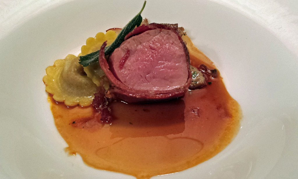 Veal Shenandoah: Local Prosciutto Wrapped Loin of Veal with Country Ham and Fontina Cheese Ravioli.