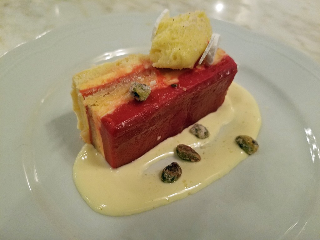 Blood Orange Gateaux, a crème anglaise, pistachio buttercream, crispy meringue, and candied pistachios dessert.