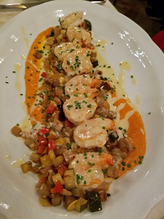 My wife had the Grilled Shrimp Brochette with Ratatouille , Tomato Coulis, Garlic Butter Sauce. The shrimp was cooked perfectly with a wonderful garlic butter sauce.