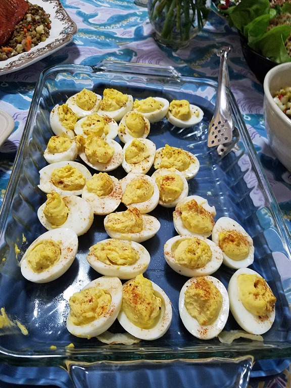 Deviled eggs, half dusted with Dizzy Pig Bombay Currish and half with their Pineapple Head seasonings.