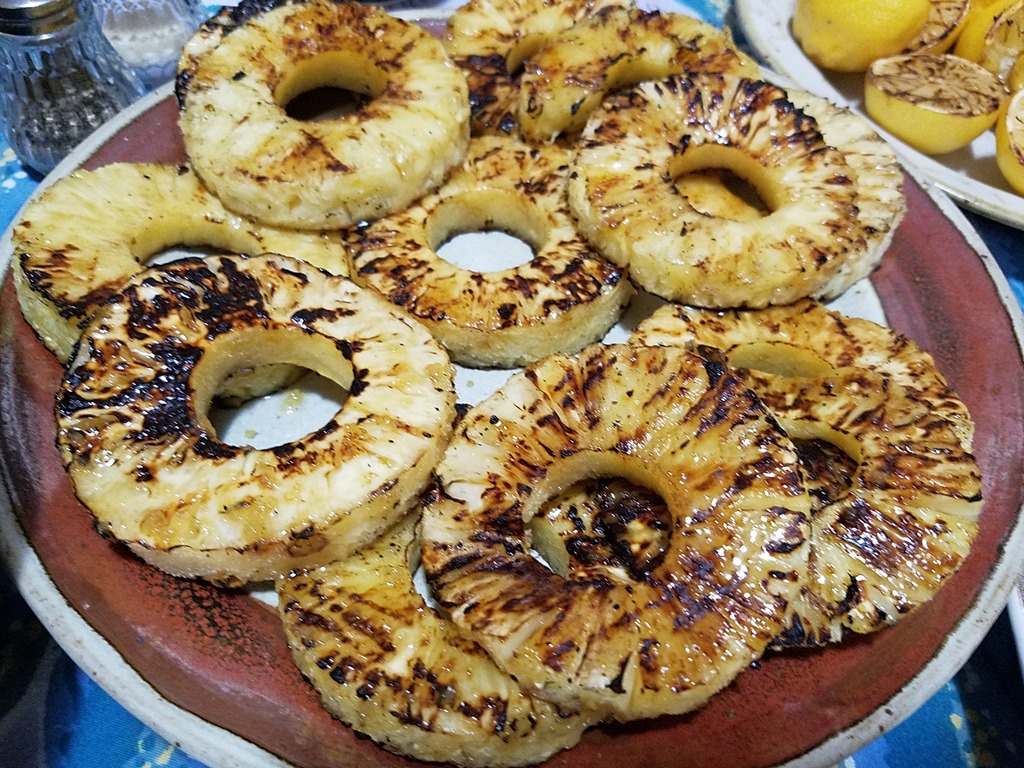 Grilled pineapple, half brushed with maple syrup and half with a ginger sauce.