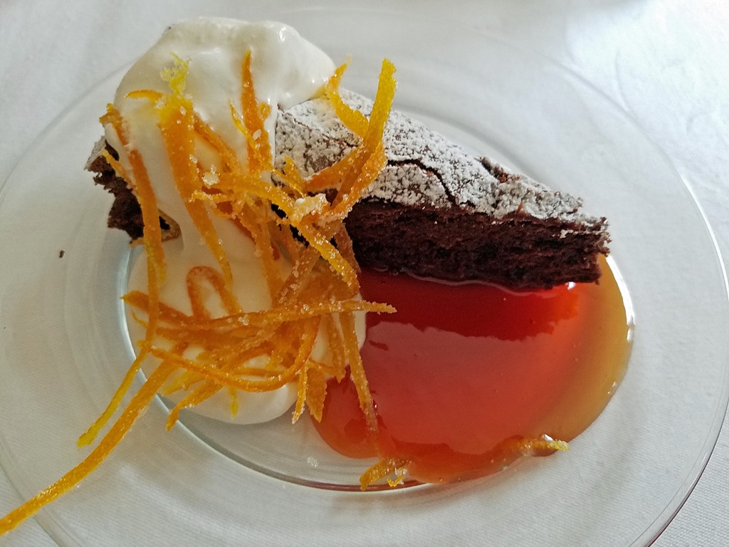 Flourless Chocolate Cake with home-made whipped cream, crystalized orange peel, and a blood orange sauce.