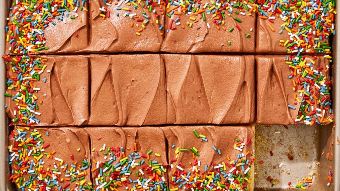 Meet your new favorite birthday cake. This easy sheet cake recipe is a little unconventional, but the tender, lighter-than-air result will make you a believer.
