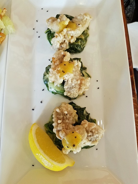 My wife tried the Crispy Fried Oysters with creamed Spinach, Curry Aioli, Black Salt, and Lemon. She really loved them.
