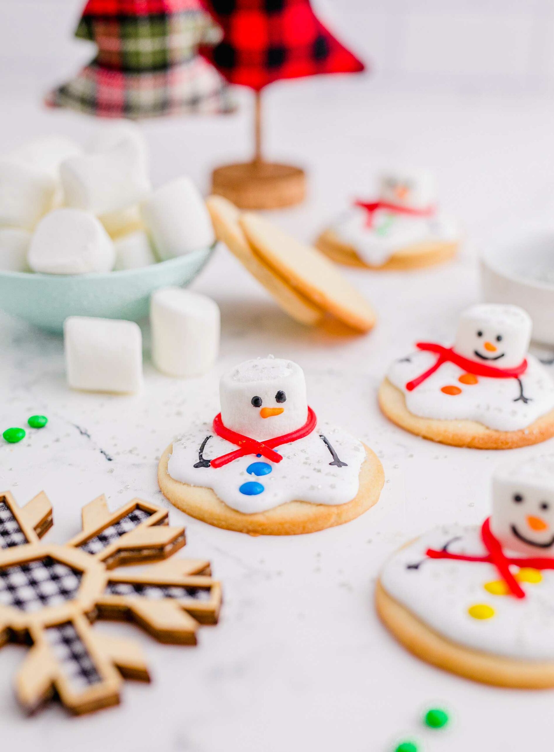 Adorably festive and deliciously homemade, these are perfect for any holiday party! Sweet, buttery sugar cookies are topped with marshmallow and royal icing “snowmen” that look like they want to run and have some fun before they melt away!