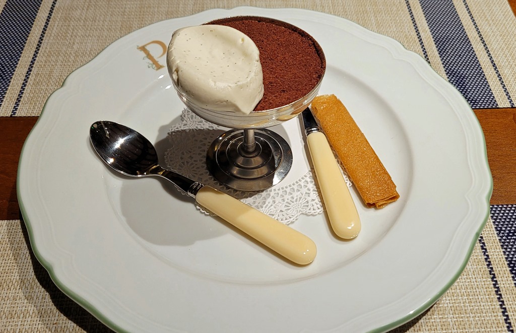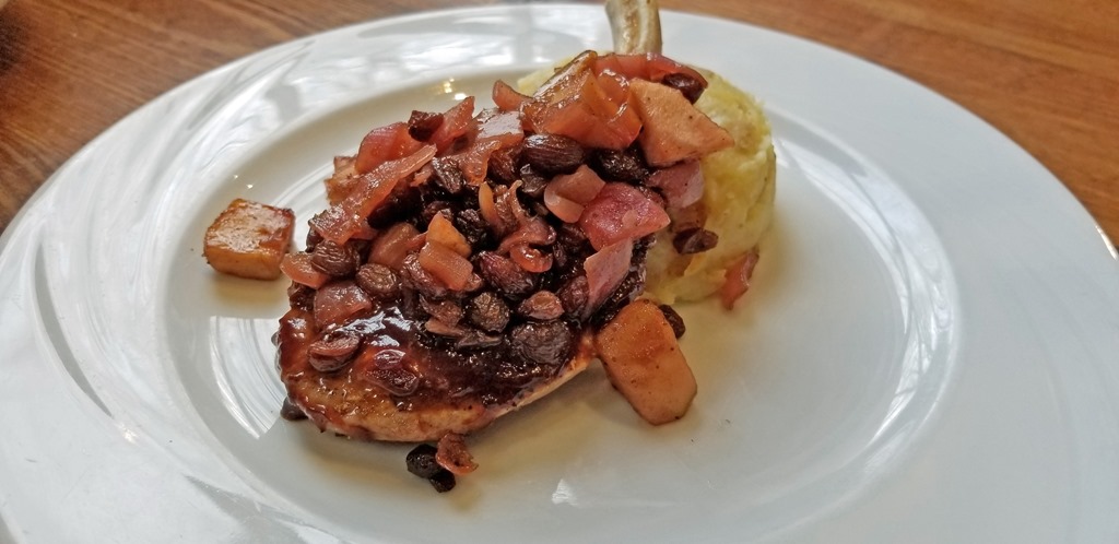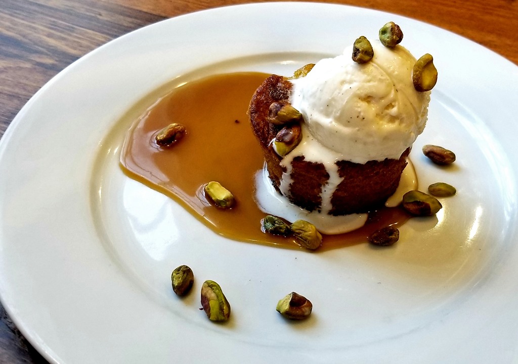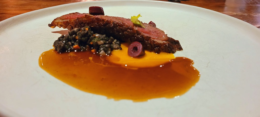 The entrée was Hearth Fired La Belle Duck with Charred Butternut Squash, Beluga Lentils, Yuzu Agrodolce, and Kalamata Olives. This is the way duck should always be made. Tender and juicy with a nice bark. The squash purée with the yuzu agrodolce is a great paring. The agrodolce was just the right consistency to drive the complexity of the dish. Cooked to long and you get lentils in a gooey mess. Yuzu is a Japanese fruit which adds to the agrodolce’s sweetness, and everything benefited from the sweetness. Trying to get a little of everything on your fork was a challenge but the only way to eat the dish.