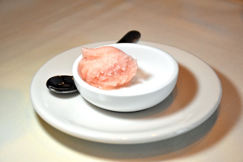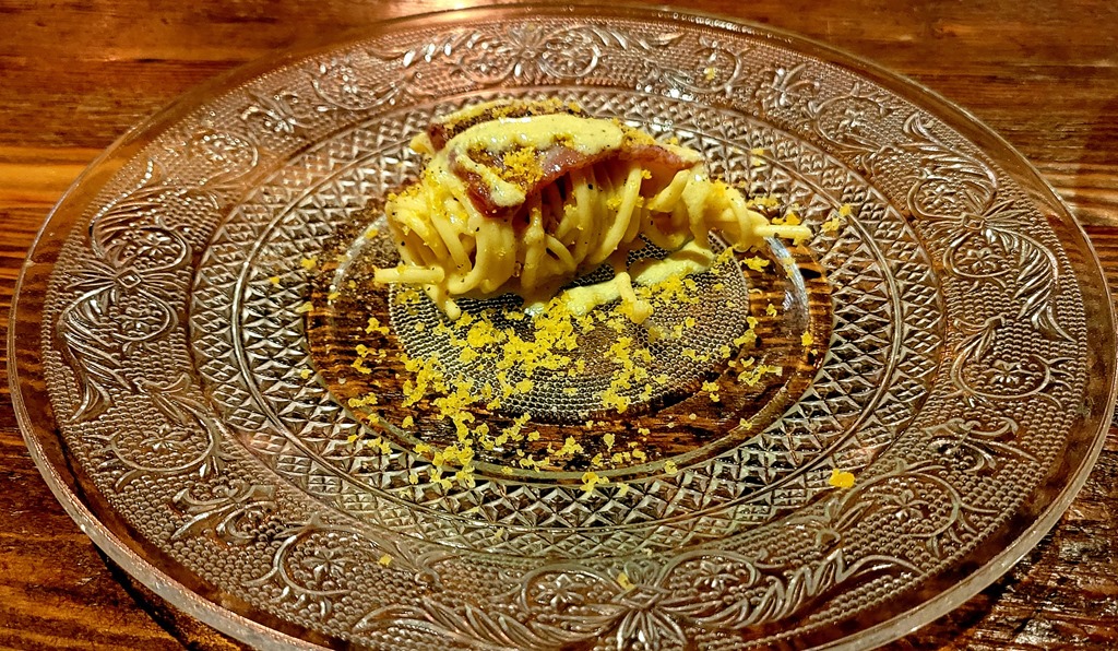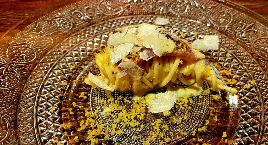 The pasta course was a Spaghetti Carbonara topped with Bluefin Toro Bacon, Tellicherry Black Pepper, Cured Duck Egg, and Pecorino Romano Cheese. The Bluefin Toro Bacon is made from the fatty part of the tuna, brined , and cured like bacon. It had a light smoke flavor that tastes nothing like tuna. We opted for the Shaved White Alba Truffles, which come at an additional cost, but are well worth it. The duck egg carbonara was delicious. The dish was a little on the salty side for us but we use no salt other than in cooking so we are more sensitive that most.