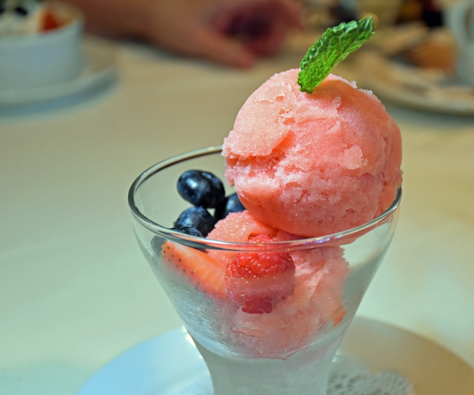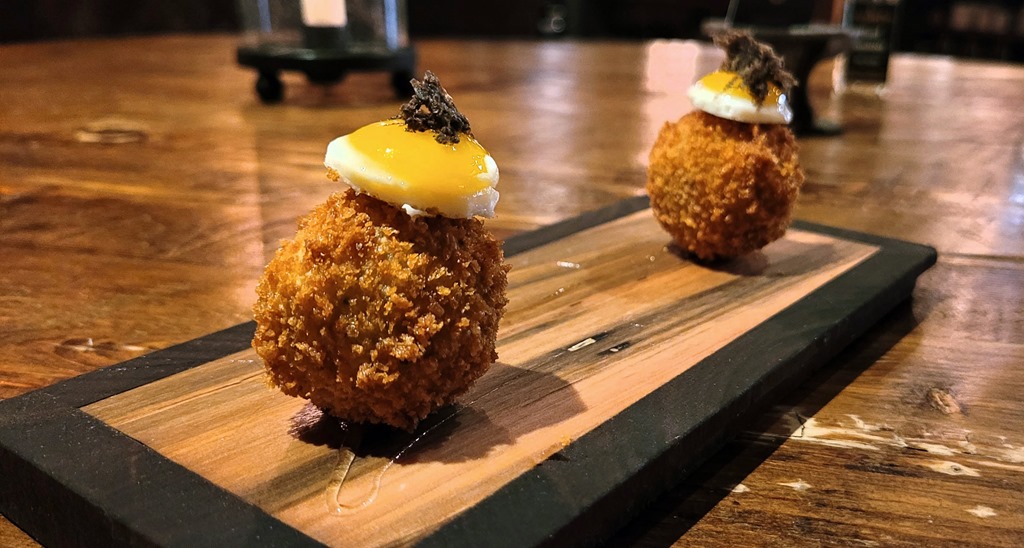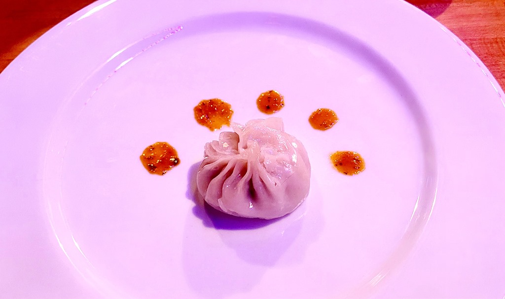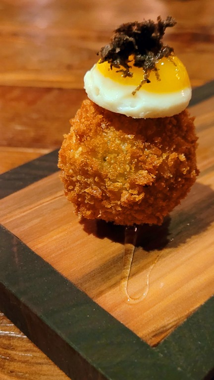 The evening starting with a wonderful Elderberry Sparkling Water drink and this Blue Cheese Risotto Ball with a quail egg. It doesn’t take much for blue cheese to be over powering but with the risotto it was just the right combination.
