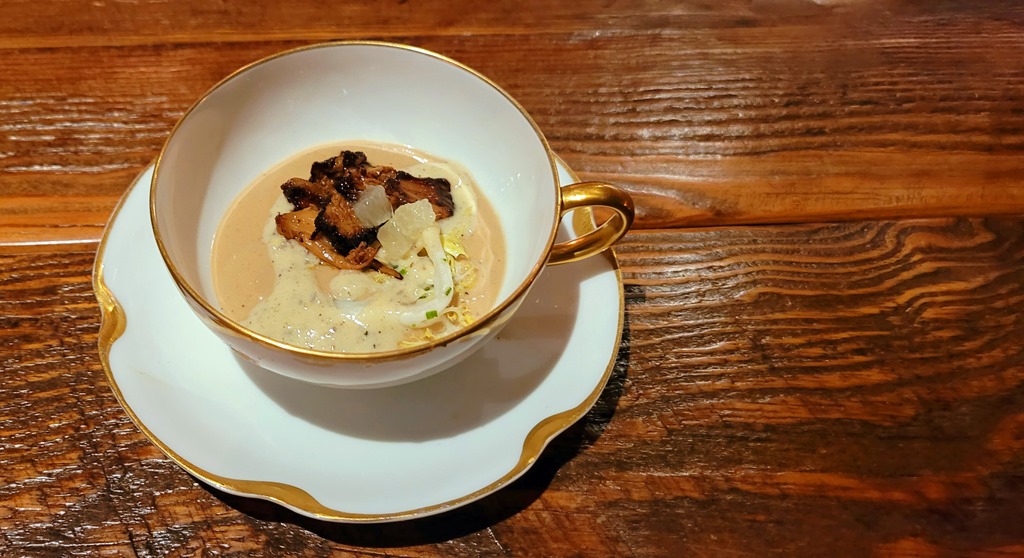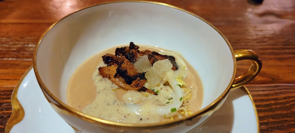 The first course was a Monkfish Ossobuco with Bone Marrow, Smoked Hakurei Purée, Winter Greens, and a Bacon and Seaweed Broth. The monkfish was cooked perfectly and the bacon and seaweed broth was awesome. We asked for spoons to make sure we got it all. The noise level is low to moderate and comes in swells. In between courses it’s at it’s loudest. As the dishes make it to the tables it quiets considerably. At one point so many people were scraping to get every bit of broth it sounded like cicadas had returned.