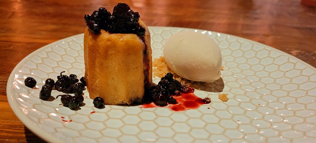 Baba au Rhum – I believe translates to Dessert is Why We Eat. A yeast risen cake with a crispy Huckleberry Sauce, Puffed Amaranth, and Espresso Gelato. An intense warm/cold, sweet/sour dessert is a lovely way to end the dinner.