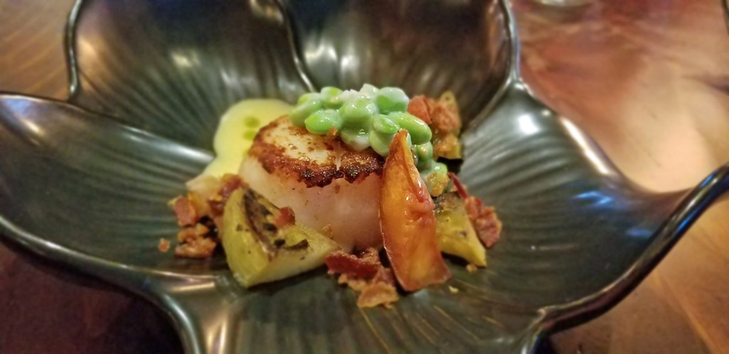 A Seared New Bedford Scallop with Coconut Saffron, Edamane, Peaches, and Crispy Pork Belly. The scallop was cooked perfectly and nicely paired with the crispy pork belly.