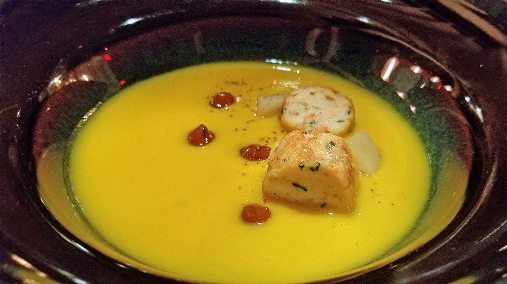 Next up, Sunnyside Farm Kabocha Squash Soup with Carolina Shrimp Sausage and Tomato-Hyssop Preserve. Kabocha Squash is a Japanese winter squash with a nice slightly sweet taste. The soup was a very good accompaniment for the amazing shrimp sausage. It took me a couple of minutes to wrap my head around shrimp sausage. A first for me, it was fantastic with a nice shrimp taste paired with a hint of fennel.