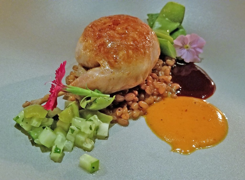 For the entrée Chef served a Sorghum Glazed Cavendish Quail with Toasted Wheat Berries, Romano Beans, Castelvetrano Relish, and Blackberry Agrodolce. The sweetness of the sorghum in the skin mitigated the gameyness of the flawlessly cooked quail. I especially like the Castelvetrano Relish.