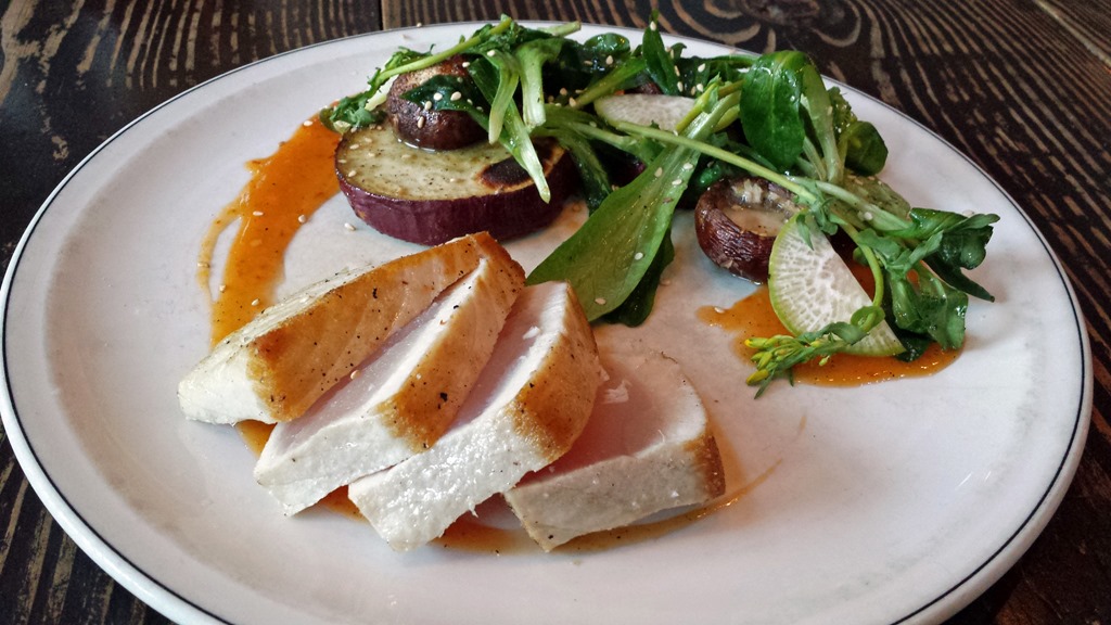 Elizabeth decided on the Hatteras Island, NC Albacore Tuna with Sweet Potatoes, Mushrooms, Lamb’s Lettuce, and spicy nectarine dressing. What looks like a dead ringer for eggplant is white sweet potato. She said her tuna was very good.
